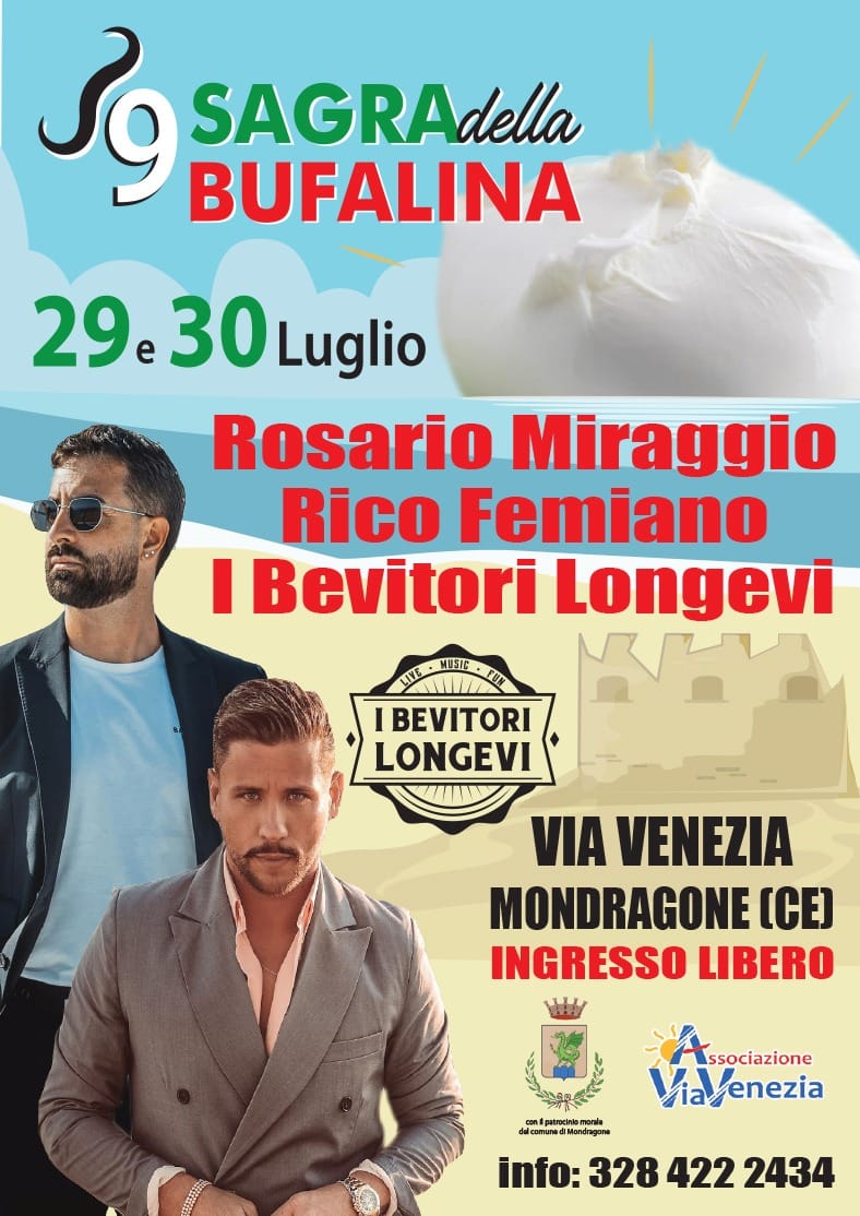 Nona edizione per l’apprezzata Sagra della Bufalina con stand gastronomici che proporranno le prelibate mozzarelle di bufala della zona e le ricette di carne di bufala. Per tutta la durata della manifestazione sono previsti spettacoli musicali e, per i più piccoli, teatrino dei burattini e animazione.